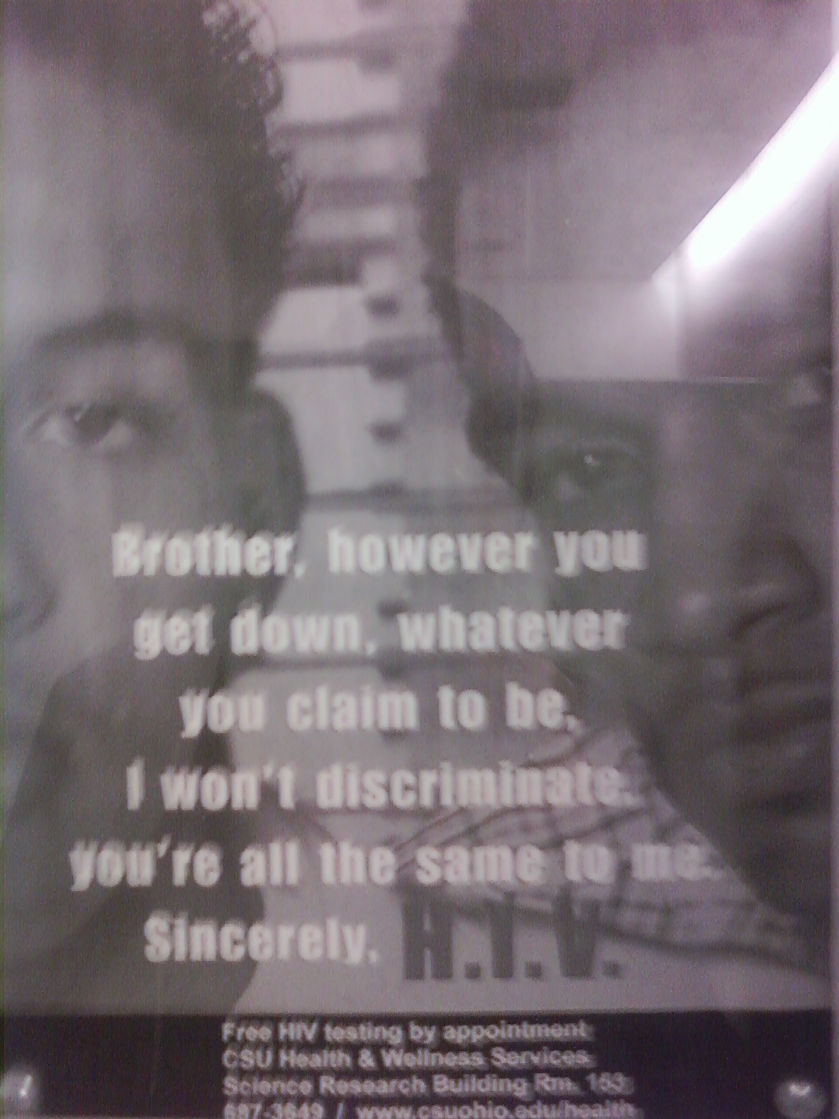 The ‘test’ like war is naturalized in what Avital Ronell, in the Test Drive, identifies as a “ghostless futurity.” All experimentation to preserve health, vitality, all attempts to overcome the conformity of established norms, are suspended in reaction to the threat of an unknown attack against the body, the modern political metaphor of homeland or fatherland. Testing, as Ronell explains, is a perpetuation of violence when the aim of technology is to project a passable result that simulates “an already regulated norm” rather than a reference point of “interruption and reinterpretation,” an experimentation to question the recurring code of scientific paradoxes (Ronell 2005, 208-10). The test could be a coded message in the form of a health service bulletin, a grainy black and white poster placed cleverly above a paper towel dispenser in a men’s public restroom on the east side of Cleveland. I recognize the violent code embedded in the misappropriation of ‘cool aesthetic,’ a prefiguration of black urban lexicon. Encouraging HIV testing, the health notice features a photograph of two attractive young men of color: (Black or Afro-Latinx–each noticeably of a slightly different Brown/Black complexion and hair texture type), whose faces, in frontal view, partially cropped, together resemble a figural depiction of a silhouetted profile, a gestalt vase. Text fills the negative space between the two male figures. It reads: “Brother, however you/ get down, whatever/ you claim to be, / I won’t discriminate, /you’re all the same to me. /Sincerely, H.I.V..” Then, at the bottom of the ad, the text reads: “Free H.I.V. Testing by appointment/CSU Health and Wellness Center.”