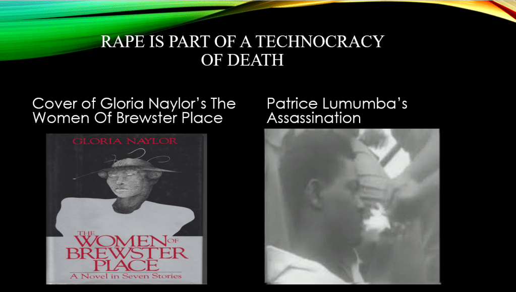 Challenging the biopsychosocial model of Cartesian and Lockean metaphysics, Naylor’s description of an embodied cellular pain, resonant in the stomach and central nervous system–which Lorraine “screamed to death” and “that supplied her with the ability to love or hate”–invokes the ancestral pain and trauma resulting from technologies of enslavement and rape perfected on the bodies of Black women and men, and anticipates a science of epigenetics still, at the time, largely secluded from fields outside biogenetics. Reminiscent of newsreel footage of a beaten and bound Patrice Lumumba being literally force fed his own words from a previously delivered political speech during transport to his torture and assassination, Naylor’s image of the soiled paper bag stuffed in Lorraine’s mouth to silence her places rape right alongside the historical traumas and political turmoil contemporaneously experienced by the intercolony of a Brewster Place as well as destabilized postcolonial nations throughout the African diaspora.